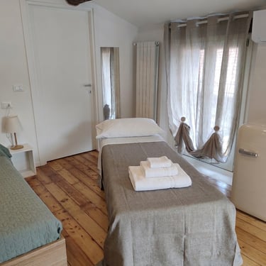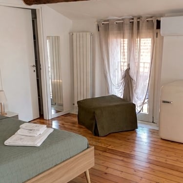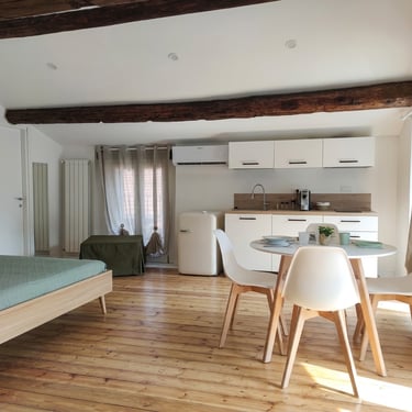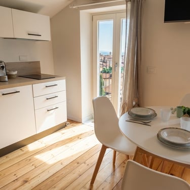 Questo splendido monolocale mansardato gode della vista lago migliore della casa, da ammirare durante il tramonto dal balconcino esterno privato. All'interno, le travi a vista in legno originario e la scala di ingresso privata rendono l'ambiente caldo e accogliente. Dispone di un letto matrimoniale e di un comodo pouf che si trasforma in un letto singolo aggiuntivo. Un tavolo rotondo in stile nordico e l'angolo cottura completamente attrezzato rendono la zona pranzo molto confortevole. A disposizione un piccolo angolo studio separato.
